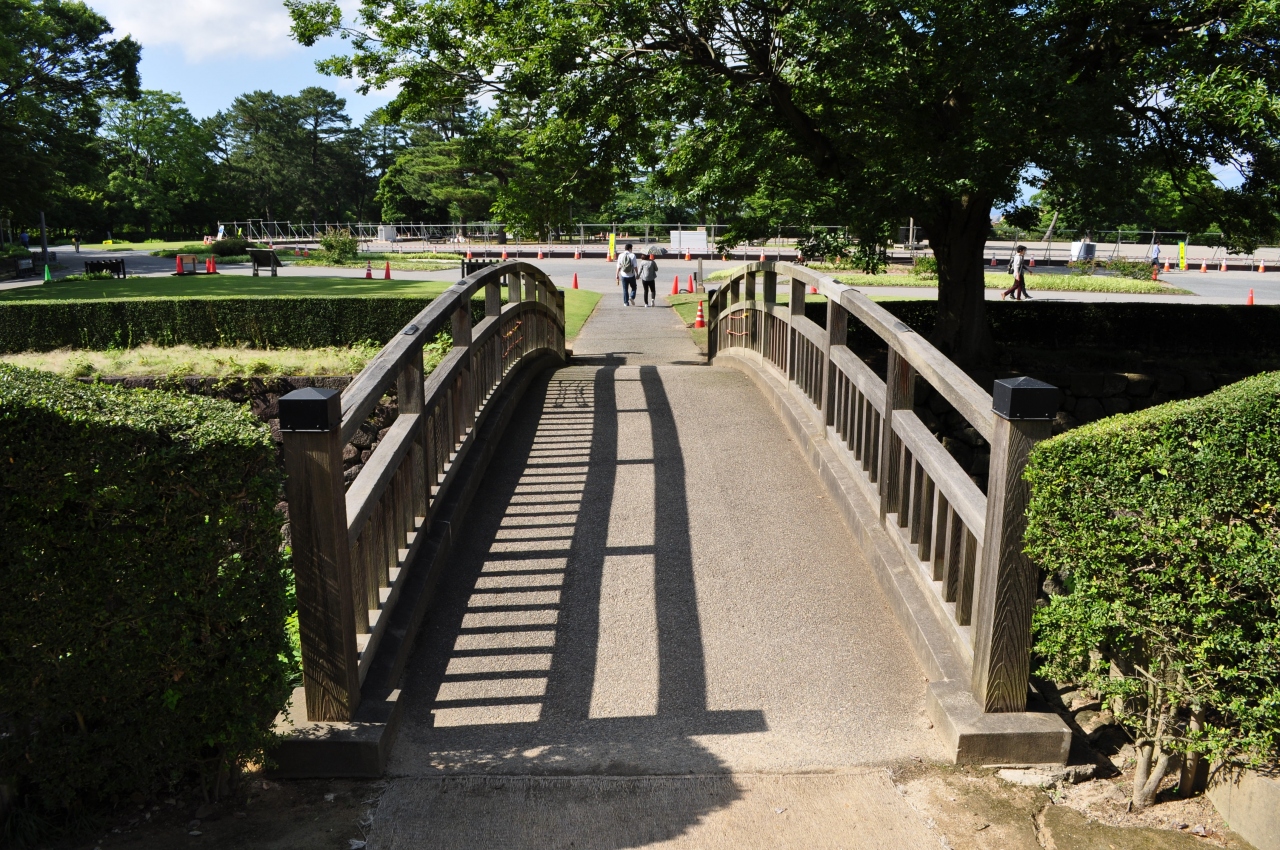 2020年6月後半に金沢市内を観光した際に金沢城に立ち寄りました。極楽橋は金沢城の二の丸広場と三十間長屋を結ぶ通りにある橋になります。空堀に架けられた橋は小ぶりですが美しい橋です。「極楽橋」という名前は江戸時代から使われており、金沢御堂に由来すると案内板には書かれていました。いまいち名前の由来ははっきりとしませんでしたが、綺麗な橋で良かったです。
