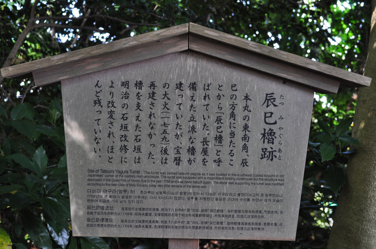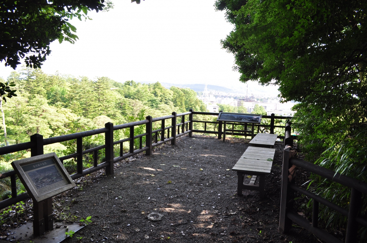 2020年6月後半に金沢市内を観光した際に金沢城に立ち寄りました。辰巳櫓跡は三十間長屋から鉄門跡を過ぎ、本丸園地をさらに進んだ突き当りにあります。本丸園地の林の中を歩いていくと、突然視界が開けて素晴らしい景色が目の前に広がります。兼六園や金沢21世紀美術館方面の視界が開けています。かつて本丸園地にあった天守閣から見て、南東の方角(辰巳の方向)にあったことから名付けられたそうです。高い石垣の上にあり、高所恐怖症の私はちょっと足がすくむほどの場所でした。