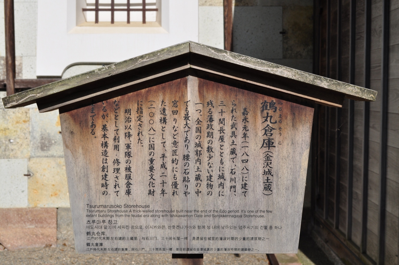 2020年6月後半に金沢市内を観光した際に金沢城に立ち寄りました。鶴丸倉庫は丑寅櫓跡のすぐそばにある倉庫で、嘉永元年(1848年)に建てられた建物で、かつては武器庫として使用されたそうです。火災による焼失を免れ、150年以上前の建物が現在でも残っています。国指定重要文化財にも指定されている大変貴重な建物になります。案内板には全国の城郭内土蔵の中でも最大規模と書かれており、大変見ごたえがあって良かったです。当時の建築物の美しさというものがよくわかる建物でした。