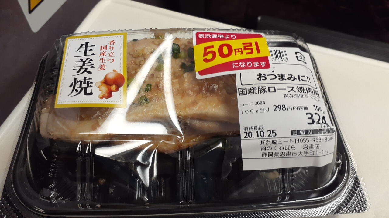 2020年10月25日の18時頃に入店し、当日は1本120円する「ジャイアントBOO」というソーセージと1パック300円程度する豚のしょうがやきを購入しました。
