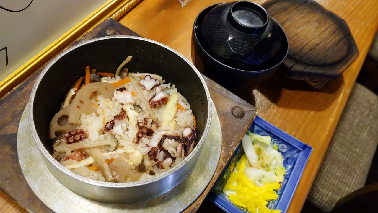 秋晴れの土曜日の昼時だったので、地元の名物であるタコが目当ての観光客でほぼ満席でした。カウンター席が辛うじてあき、やっとタコ定食を注文しました。刺し身、天ぷら、釜飯、茶碗蒸しなどタコ尽くしでした。地元の名物を堪能しました。