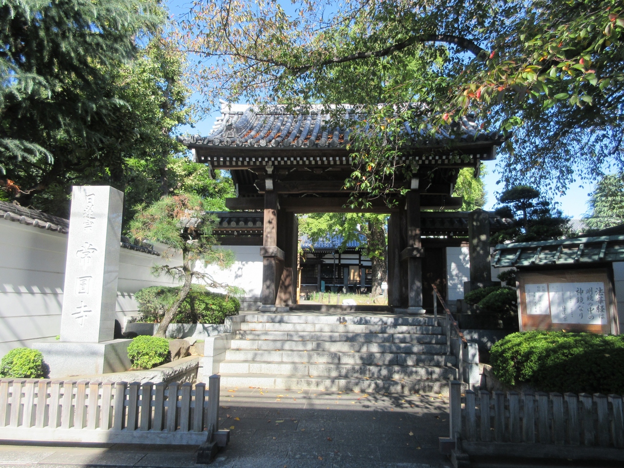 東急東横線・都立大学駅北口から5分ほど、柿の木坂通り沿いの横道を左に入ったところに建つ日蓮宗の寺院です。1590年に創建された寺内には、縦407㎝、横220㎝の大きな涅槃図が納められ、2月に1日だけ御開帳されるそうです。涅槃図は見られませんでしたが、境内に植えられた樹齢300年と言われる、高さ25m、幹回り4mの大イチョウを見ることができました。境内に建つお堂の中には、開運の菩薩である妙見菩薩と心に安らぎと満足を与える七面大明神が祀られ参拝することができました。閑静な住宅地に建つ寺らしさが感じられる寺です。