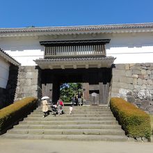 昭和46年に再建された門で、城址公園にある3つの門の中で一番大きく重厚感があります。正面からはわかりませんが、裏側に楼門の2階部分を利用したSUMURAI館があります。刀剣や甲冑の展示コーナー(\200、天守閣との共通券なら\610)と売店があります。