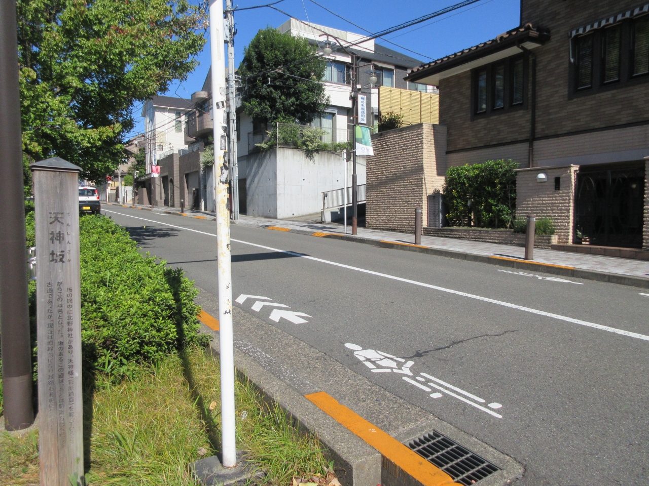 都立大学駅北口近くの目黒通り都立大学前交差点から柿の木坂通りを進むと上っていく坂になります。天神坂です。休日午前にめぐろ区民キャンパスへ行く際に通りました。交通量は多く、歩道を歩く人も多かったです。坂の途中に菅原道真を祀る北野神社があることから天神坂と名付けられたことが説明柱に記してありました。説明柱はめぐろ区民キャンパス公園入口の歩道にあります。天神坂の両側は商店街ですが、店は少なかったです。都立大学駅周辺散策で近くに寺があるので歩きたい坂道です。