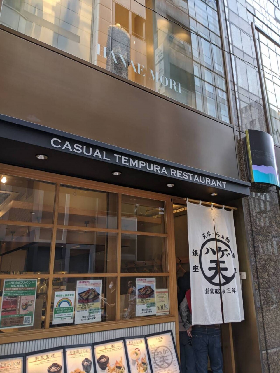 銀座4丁目交差点から直ぐ。銀座すずらん通り沿いにありました。天ぷらの老舗「ハゲ天」と博多豚骨らーめんの人気店「一風堂」がコラボしたお店です。揚げたてサクサクの天ぷらが乗った天丼と濃厚でクリーミーな豚骨らーめんのセットは超お薦めです。