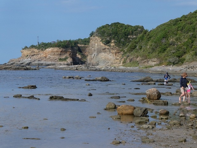 浜田市はかつて国府海水浴場に何度か来たことがあり、畳ケ浦という景勝地があることは知っていました。ただ、どんなものか分からず、訪れないまま数十年が経過しましたが、ようやく見ることができました。むき出しになった太古の海底が地上に露出し畳のように見える地形でした。山陰の海岸や首都圏だと三浦半島西岸でよく見る地形です。海水浴場から少し離れた場所にあり、長めのトンネルをくぐると、一面に平らな岩場が広がります。そこにぽつぽつあるのが、波の侵食によってできた腰掛け状の岩。また少し海に入ると無数の貝の化石や鯨の化石などを見ることもできるそうです。ただ、36度を超える猛暑日に訪れ、かつ海に入る準備を全くしていなかったため、このままでは熱中症になると、早々と退散。化石等を見るに至りませんでした。遊泳地域ではないんでしょうけど、何組かの親子が海水浴をしていました。夏場なりそれもあり。ただ、冬とかはかなり寒そうです。国の特別記念物です。」