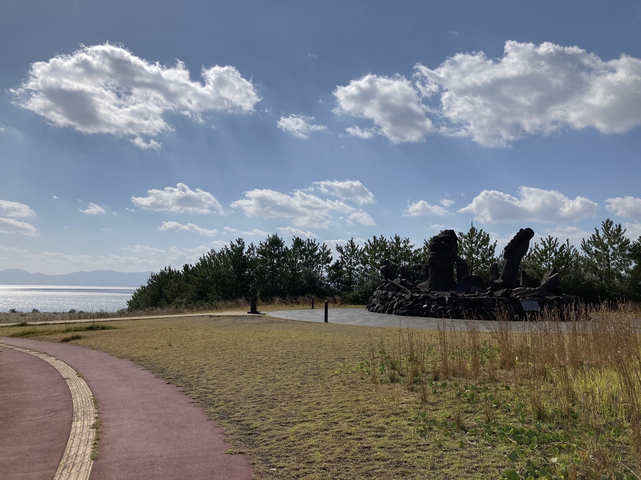 鳥島展望台から500mで赤水展望広場です。その広場の入口にある溶岩で作った大きな彫刻です。以前長渕剛のコンサートが行われた際にできた像とのことですが、非常に大きく迫力がありましたので、展望台から歩いて行くことをオススメします。