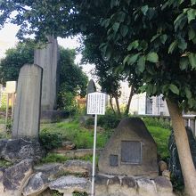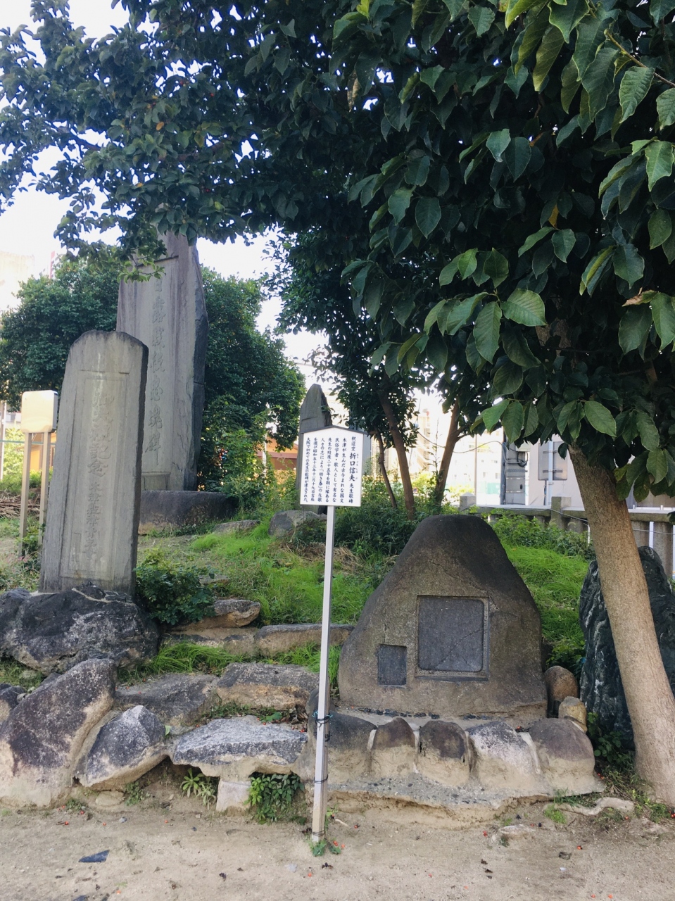 大国主神社にあり、おにぎり形の石碑で文字が刻まれていましたが色褪せてなにが書いてあるかわかりませんでした。横には看板で簡単な石碑の紹介がありました。石碑の下にはコンクリートで固められた石がいくつかあります。