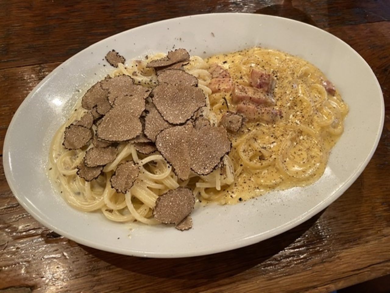 秋トリュフクリームとカルボナーラのダブルスパゲッティ!