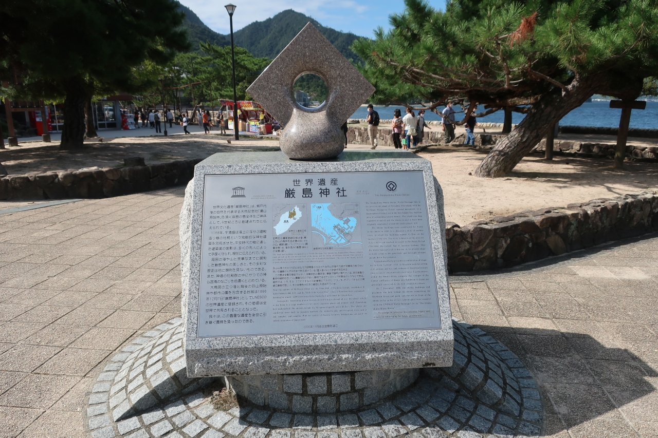 宮島桟橋の近くに建っていました。日本三景の一つである宮島にフェリーで到着し、厳島神社を目指した途端にこちらの記念碑があります。1996年12月7日に世界遺産に登録されました。石碑には穴が空いていて、そこから大鳥居を見ることができますよ。ただ、現在、大鳥居は改修工事中でカバーがかけられていますが。。。ぜひ、厳島神社へ向かう前に石碑を見つけてみて下さい。