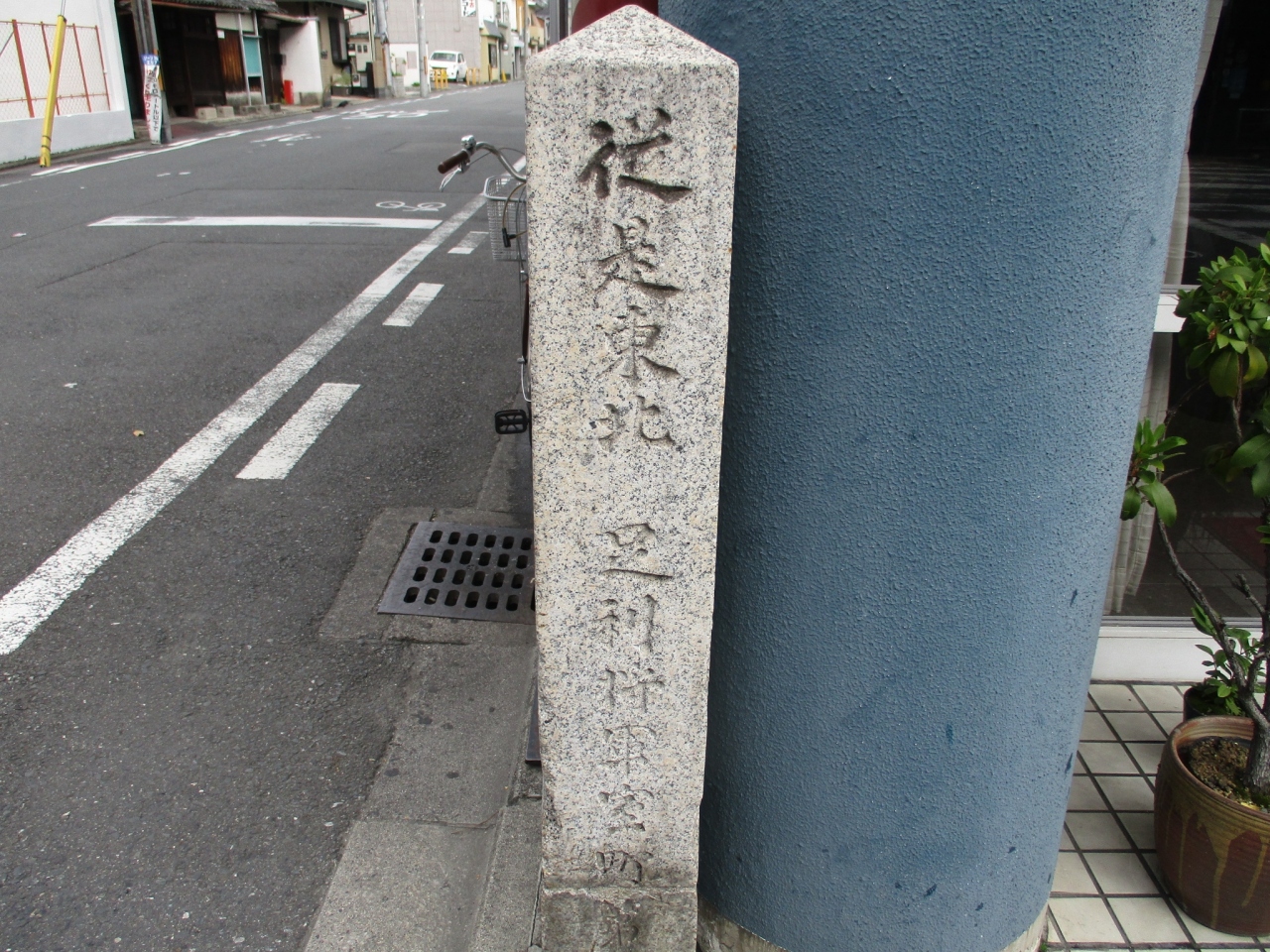 今出川通り室町交差点、散髪屋さんの横に碑があります。何気なく歩いていると気が付きにくいと思います。この地は足利3代将軍義満が1378年(永和4)に造営した邸宅で室町幕府があった場所です。花の御所とも呼ばれています。烏丸通と室町通、今出川通と上立売通に囲まれた東西110メートル、南北220メートルに多くの殿舎、庭園美をきわめ、室町時代の政治、文化の中心地でした。しかし応仁の乱で焼失しました。遺構がいろいろ見つかっています。