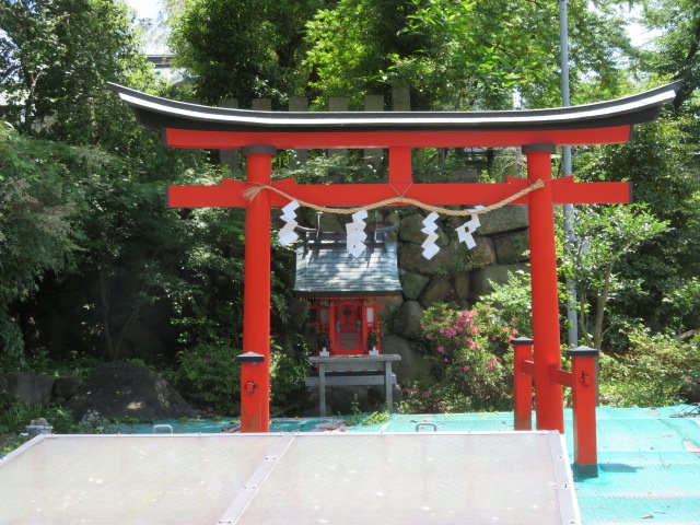 ネットが貼ってあるからちょっと分かりにくいですが、そのネットの上に赤の鳥居があり、その奥に赤の祠があるという非常に珍しい神社です。ただ、ネットの上にあるのでさほど景観がいいわけではありません。弁天さんとえびすさんが祀られでいます。