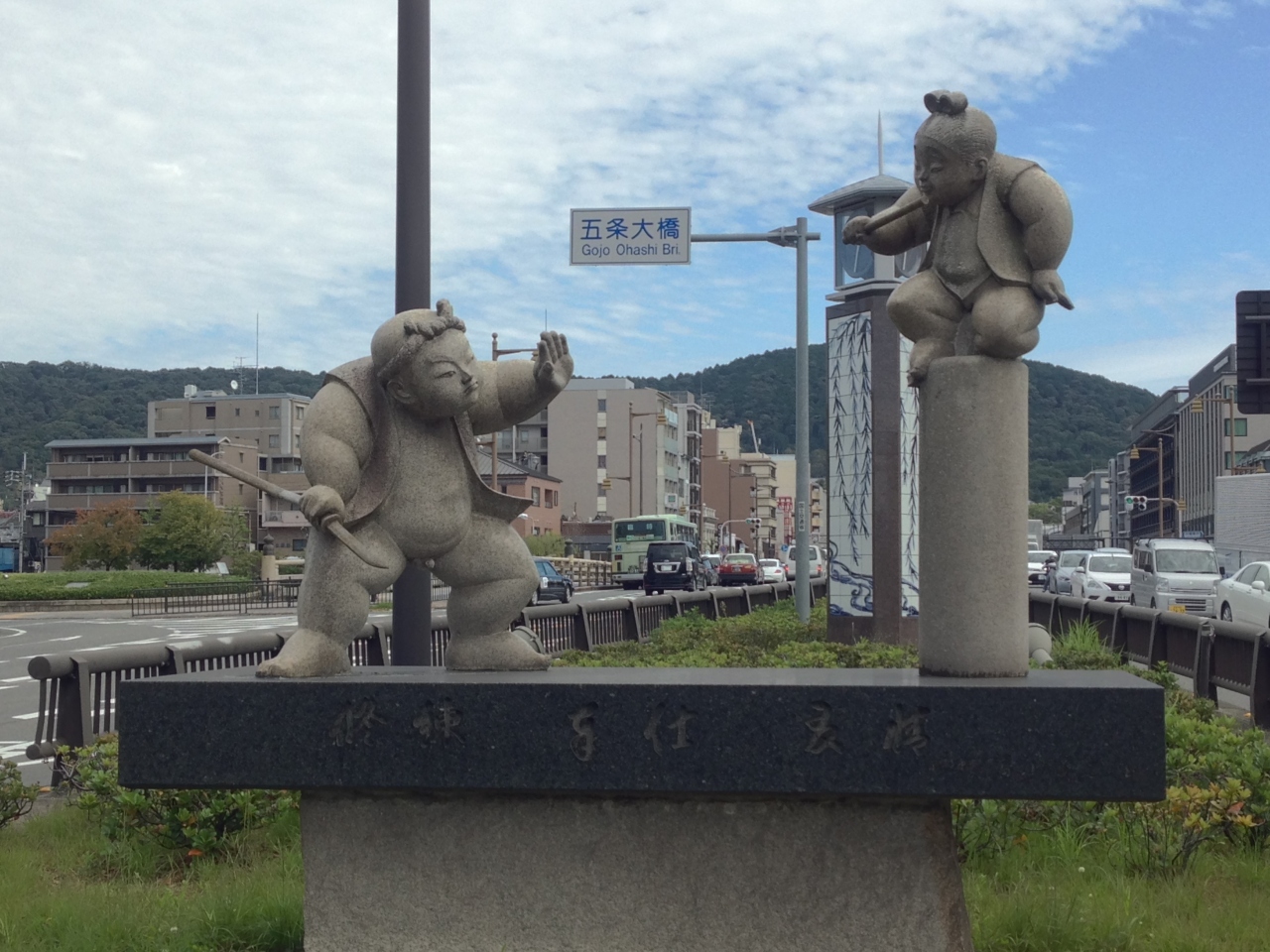 牛若丸の歌に出てくる五条の大橋に有るモニュメントです。道路に沿って中洲のような小さな公園になっている場所があり、そこに造られていました。ライトアップもされることがあるようでした。我々世代時は懐かしいモニュメントです。