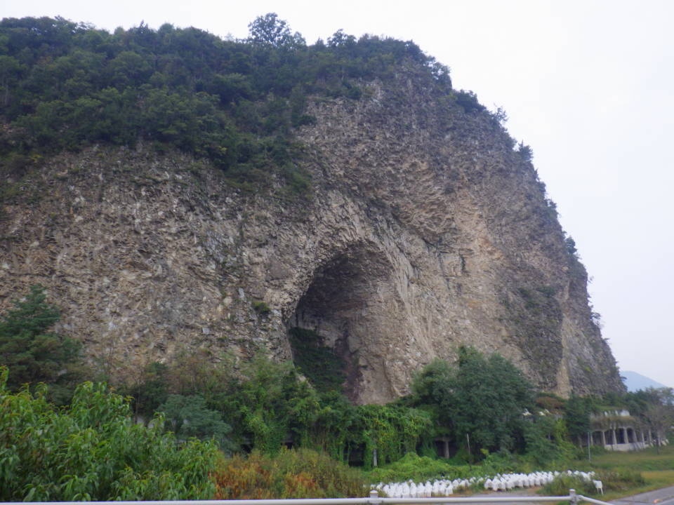 「田沢温泉 富士屋」から20分ほどで45件目の道の駅「上田 道と川の駅」に到着しました。直売所の品ぞろえはいまいちでで、GoToトラベルの地域共通クーポンも使えませんでしたが、目の前に「岩鼻」という鼻のような形をした変わった岩山をみることができました。