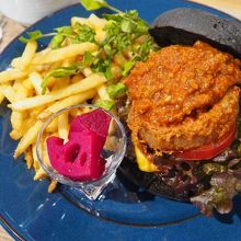 炭を生地に練り込んで焼き上げた真っ黒なバンズの間に、分厚いパティ、レタス、チーズ、サルサ風味のミートソース、そしてフライドオニオンを挟んでいる。