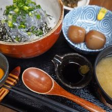 生しらす丼、小鉢、生卵、柚子胡椒と醤油、そして味噌汁から成る。