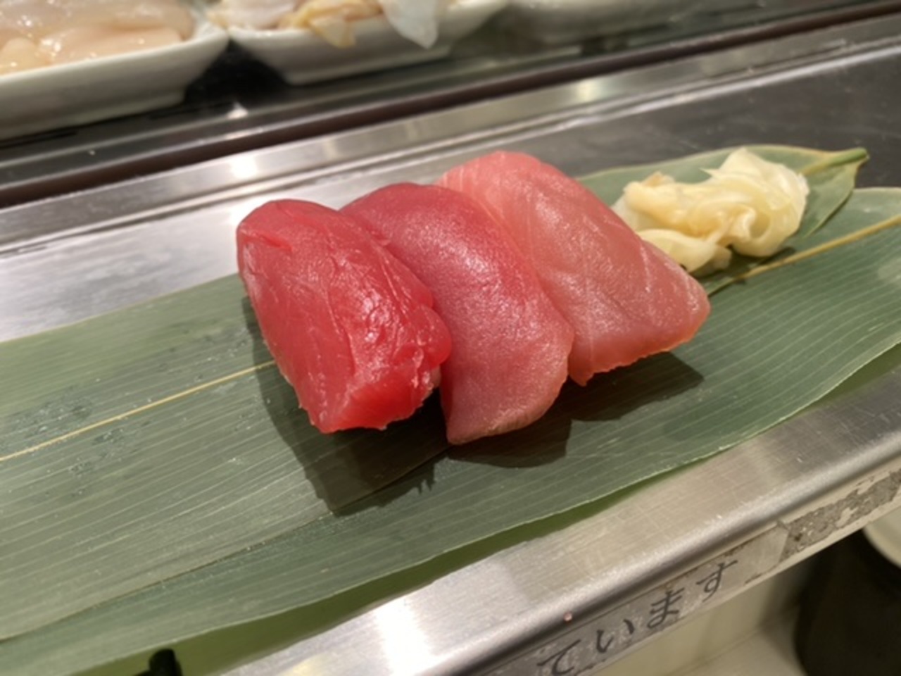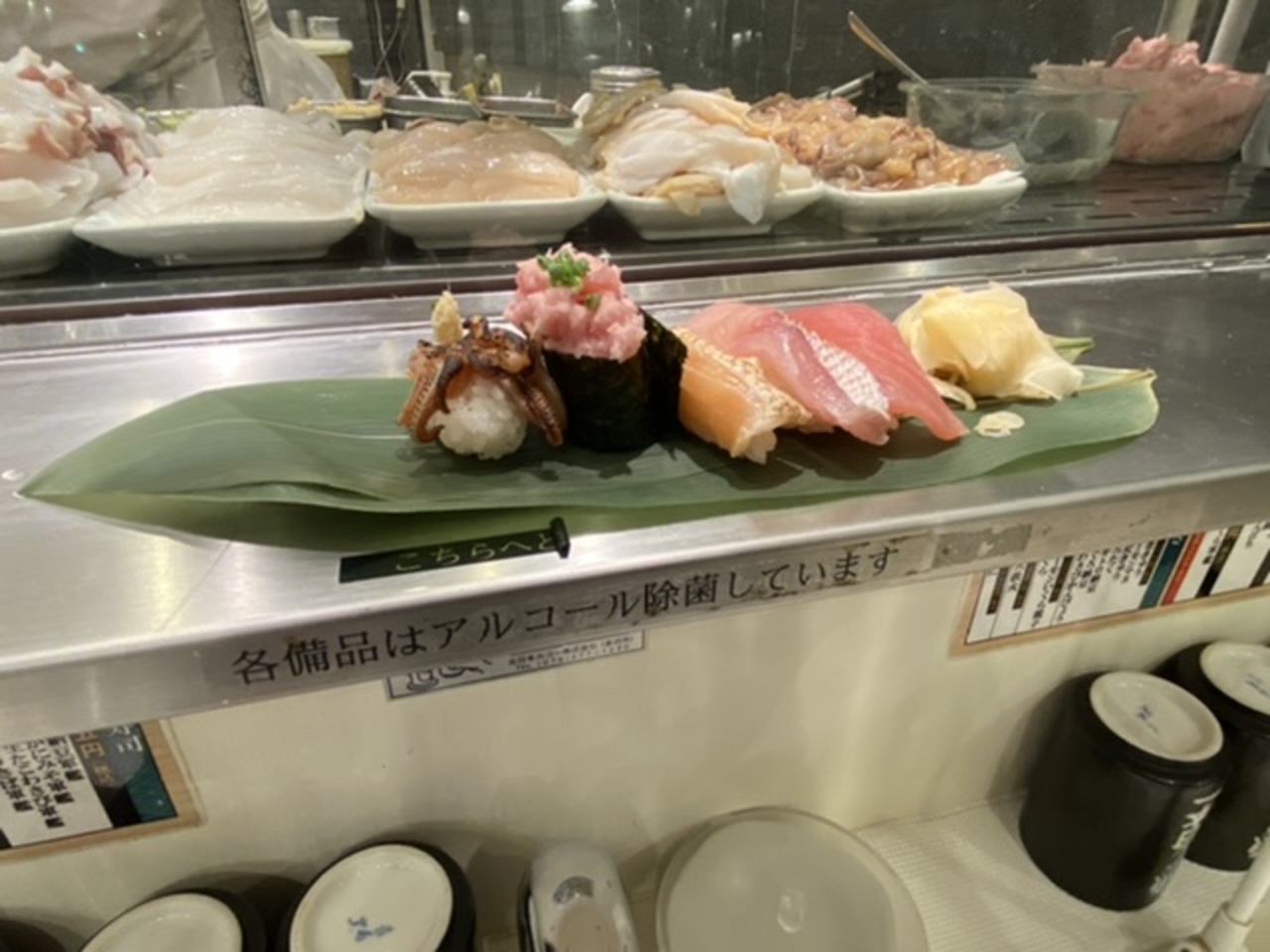 食べたのは人気5貫(まぐろ、さーもん、鯛、ネギトロ、ゲソ)、赤身3種食べ比べセット(バチマグロ、インドマグロ、生本マグロ)、穴子2貫!