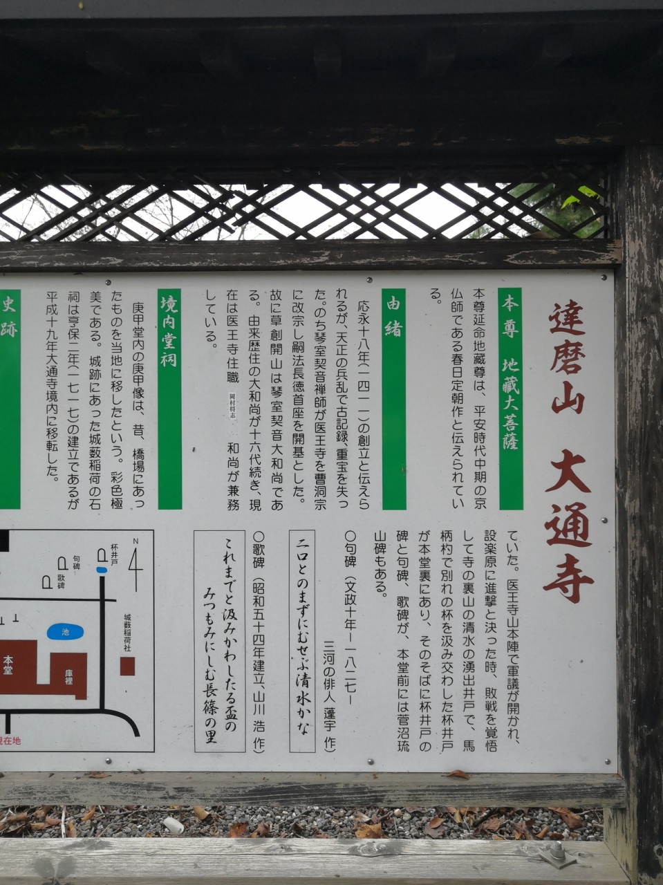 長篠城跡から比較的近いところにあるお寺です。こちらのお寺には武田方の武将らが長篠・設楽原の決戦を前に別れの水杯を交わしたと伝えられる盃井戸があります。お寺自体は比較的地味なので、それに興味がないと物足りないかも。