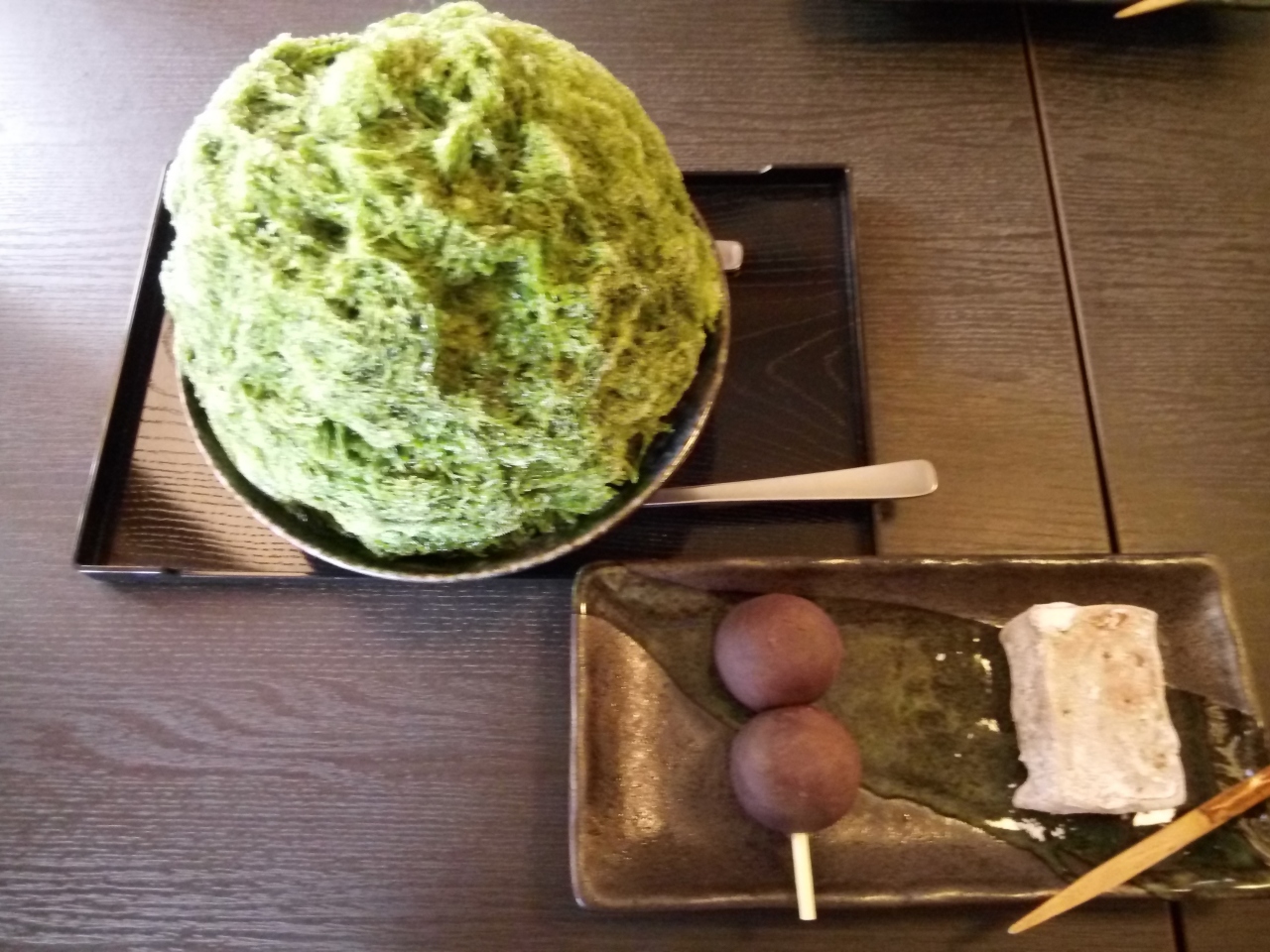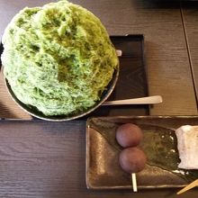 なので、宇治金時のかき氷と「ちもと餅」と「蕎麦饅頭」をいただきました。