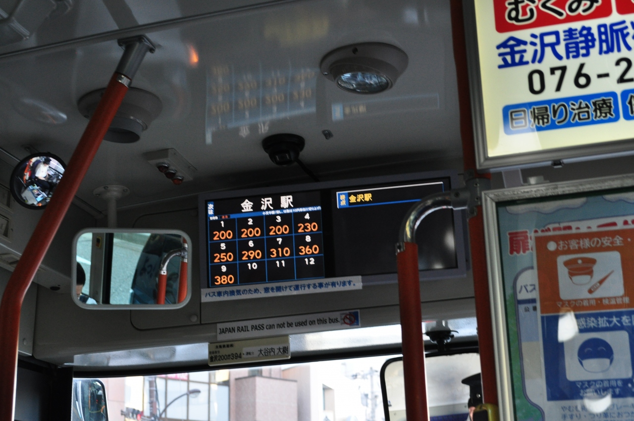 2020年6月後半に金沢市内を観光した際に利用しました。金沢21世紀美術館の北にあるバス停から、JR金沢駅まで乗車しました。旅行に行くと地方ごとにバスの乗降方式が違うのでドキドキしますね。SuicaやPASMOは使えなさそうでしたので現金での利用です。料金表も見やすくて良かったです。金沢市内の風景をのんびり見ながら10分ほどでバスは金沢駅へ。短時間でしたが快適に乗車出来て良かったです。