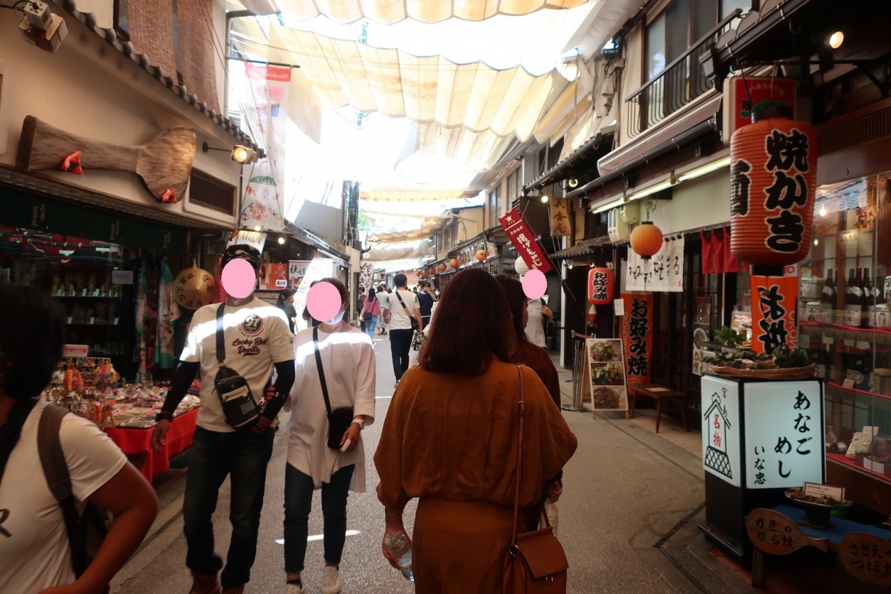 宮島桟橋から厳島神社へ向かう途中にあるメインストリートです。お土産ショップ、レストラン、カフェなど様々なショップが並んでいます。宮島名物が盛り沢山で、観光客で賑わっています。私は、午前中に宮島に到着しましたが、その時はそれほど混雑はしていなく、スムーズに歩くことができました。お昼過ぎからは、人気店では観光客でごった返してしました。ゆったりお土産ショップを見てまわりたいのなら、午前中がおすすめです。