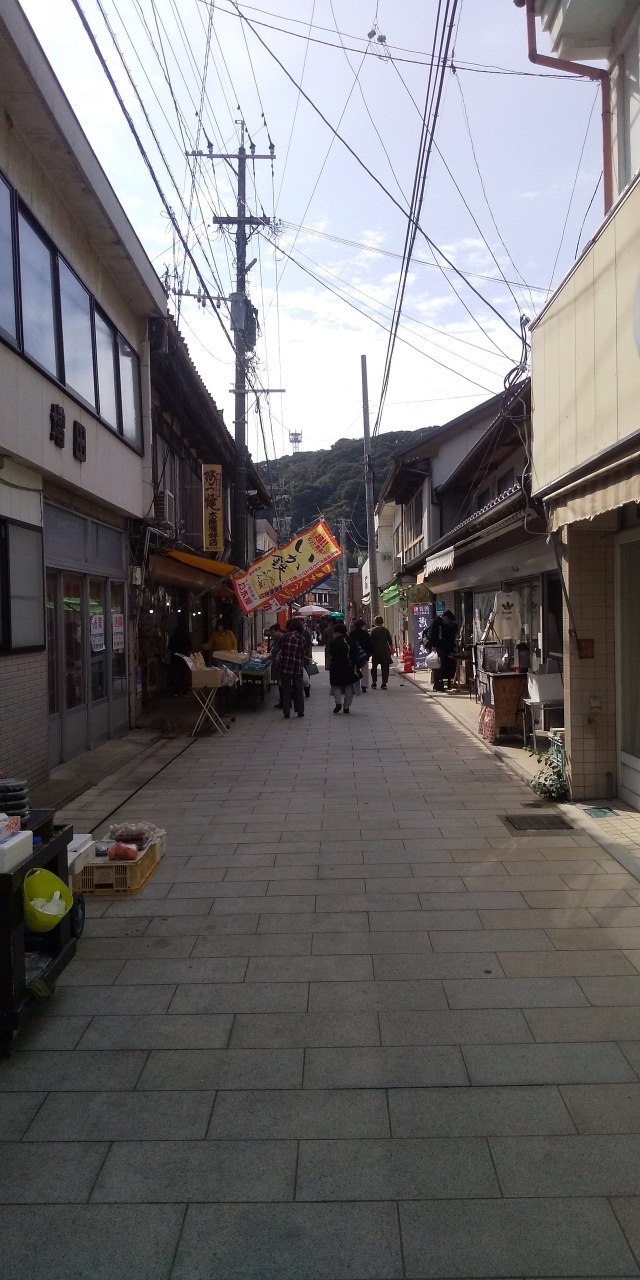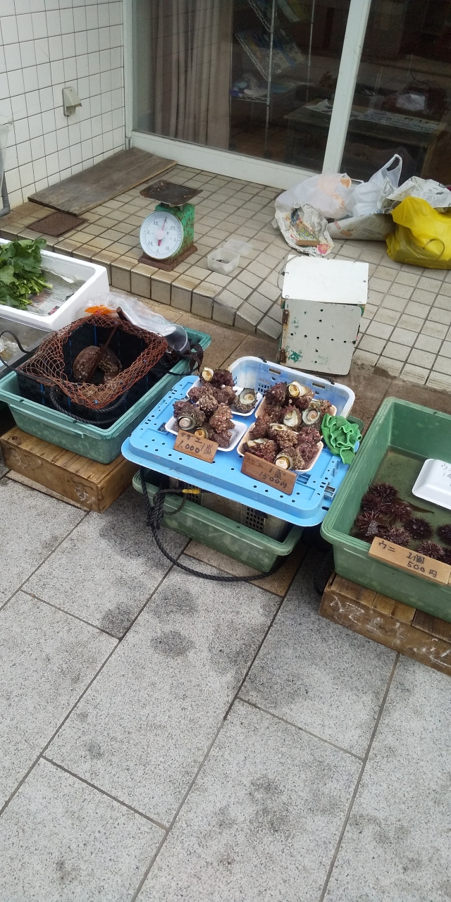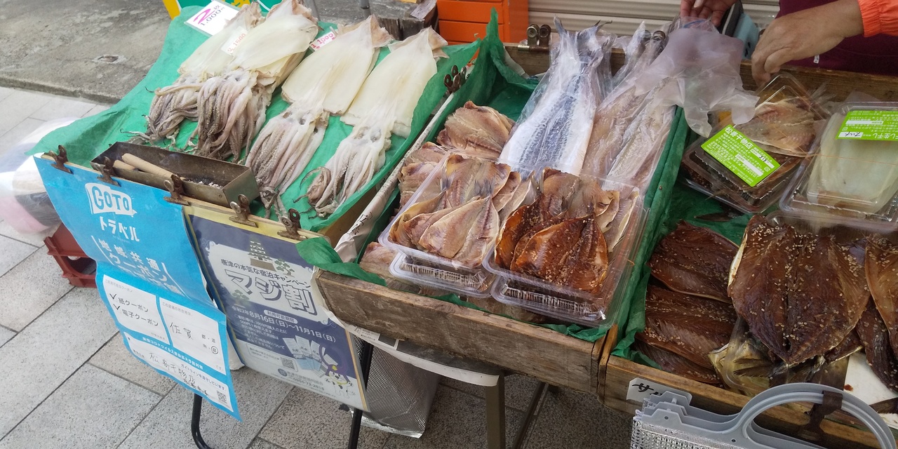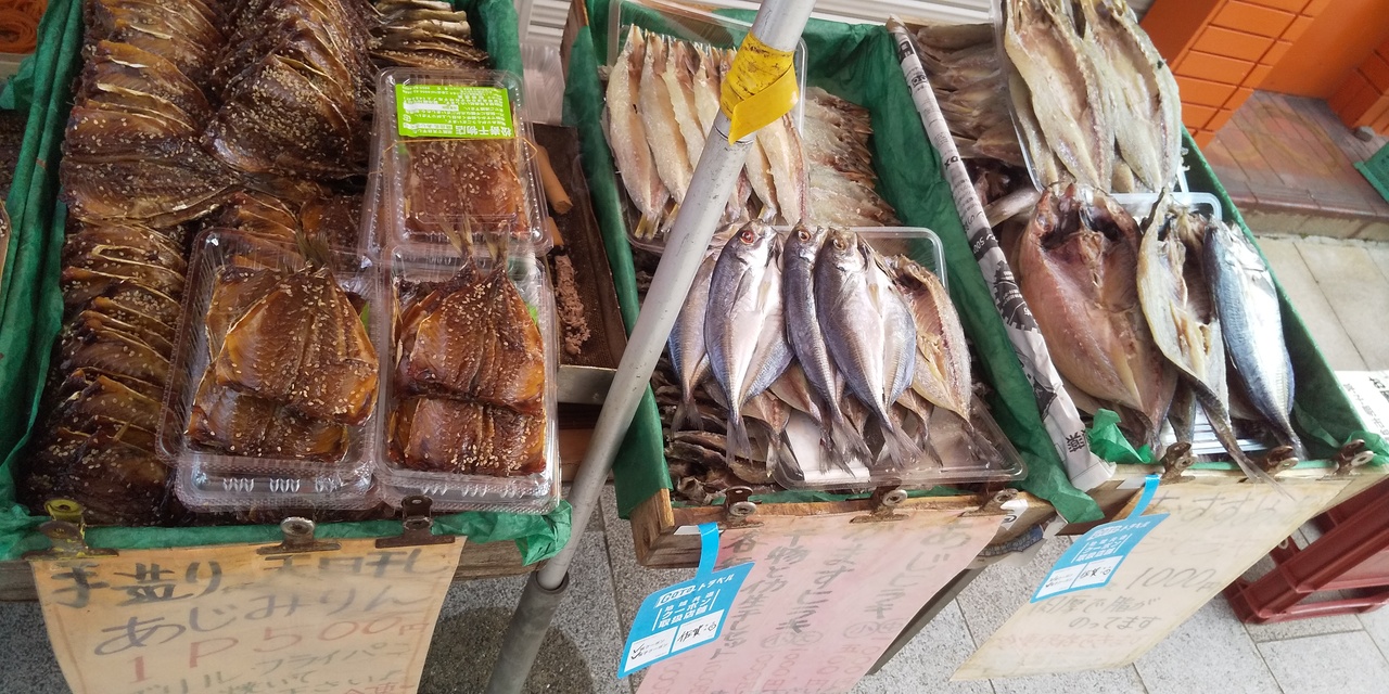多くは名産のイカ一夜干し、サバや味の干物や味醂干しのお店が並び、朝どりの鮮魚、サザエやウニを提供するお店があります。