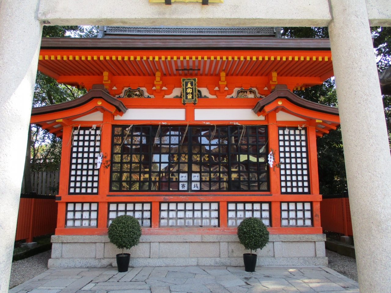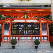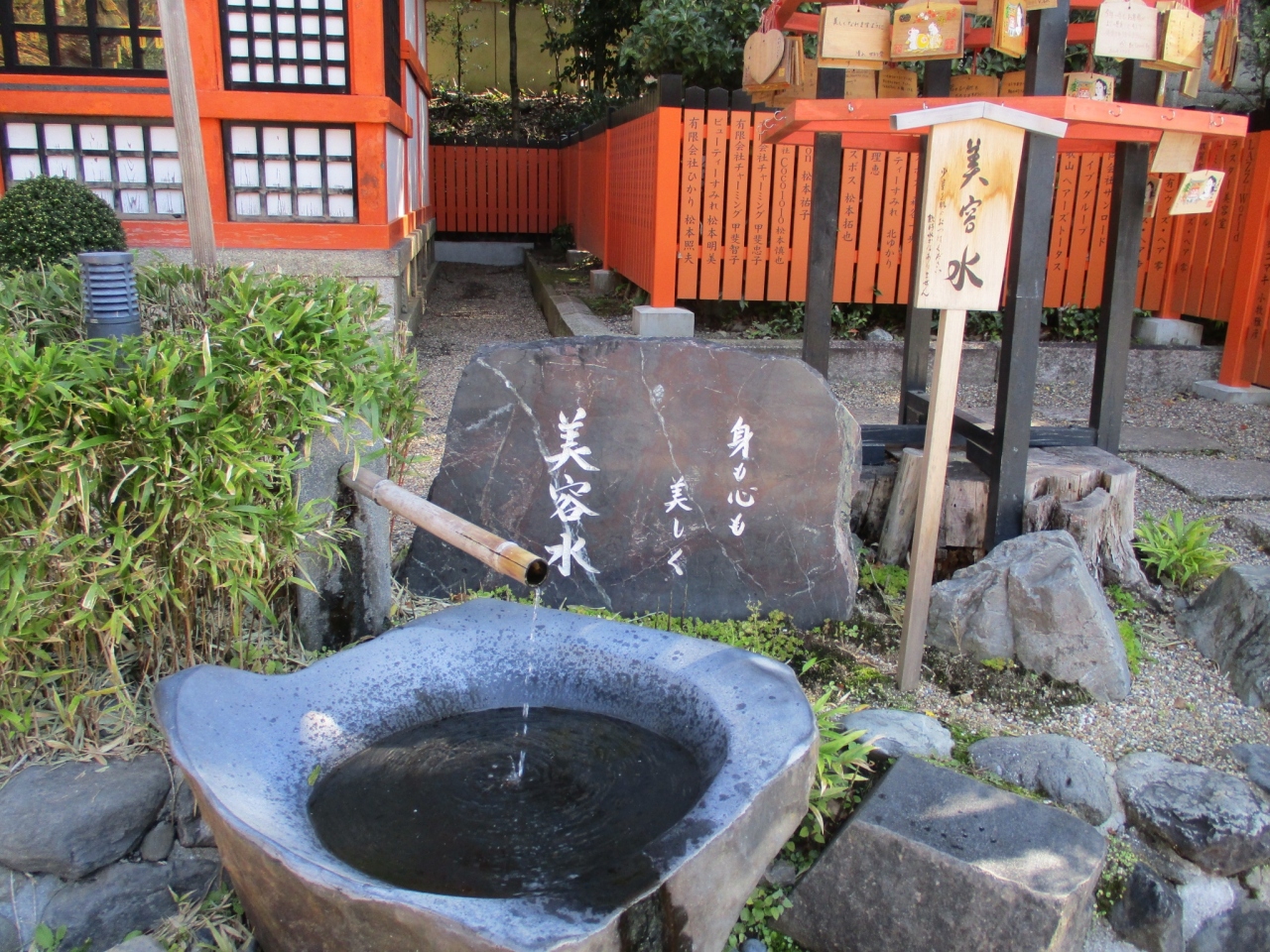 八坂神社内にある摂社の一つで、本殿の東側にあります。摂社の中でもひときわ目立つ朱色の社です。こちらは美人の宗像三女神がお祀りされています。美容の神様として有名です。こちらに美容水があり、つけると美人になれるといわれています。お参りする女性が多いです。