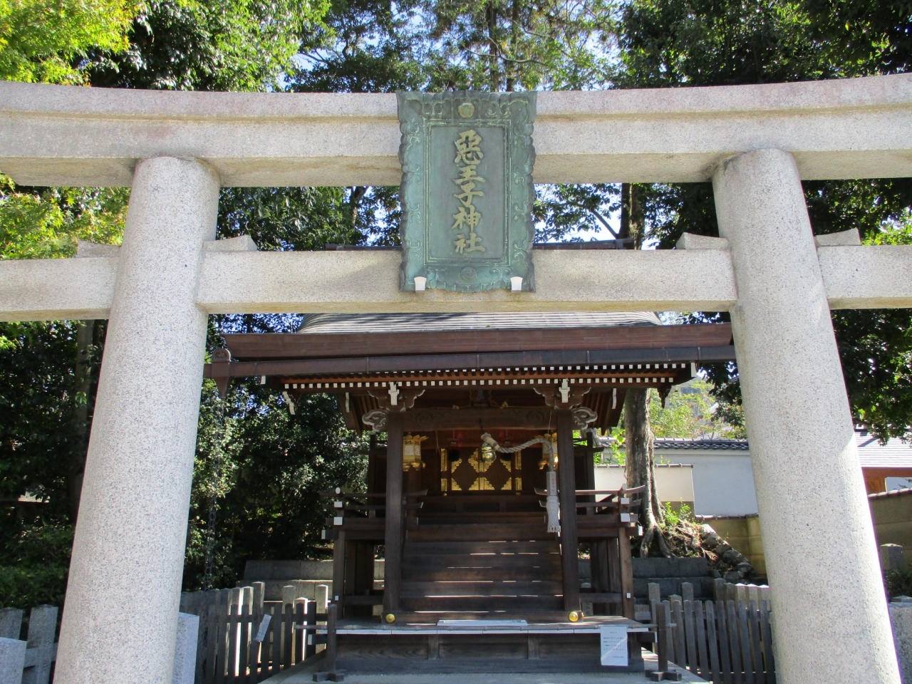 八坂神社の摂社の一つです。前回訪れた時は夜だったのであまりよく見えなかったですが、昼間に見るとまた印象が違いました。ぽってりとしたかんじの鳥居に短い参道、狛獅子などが白っぽい感じで、社は茶色で、他は朱色の社が多いので逆に目立ちました。もとは悪王子町にあったためか「悪王子町」という石碑がありました。