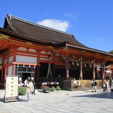 八坂神社の本殿、ひさしぶりに訪れました。天気のいい日の昼間、青空に朱色の柱の社殿がよく映えていました。横に長く優美な姿です。本殿の横では輪くぐりが行われていました。行列ができていました。本殿の周りには摂社末社が数多くあり、見所も多いです。