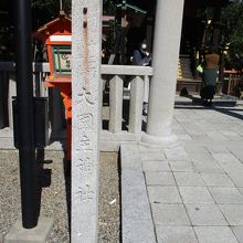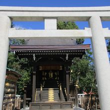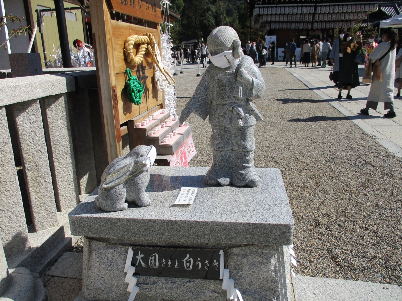 八坂神社境内にある末社の一つです。本殿の西側にあります。こちらには出雲大社の主祭神、大国主命が祀られています。大国主命とは大黒さまですが、この神様は縁結びの神様です。「縁結びの神」と大きなしめ縄などがついた看板があるのでわかりやすいです。大黒様と白うさぎの像があるのですが、大黒様はマスクをつけていました。ほのぼのとした雰囲気でした。