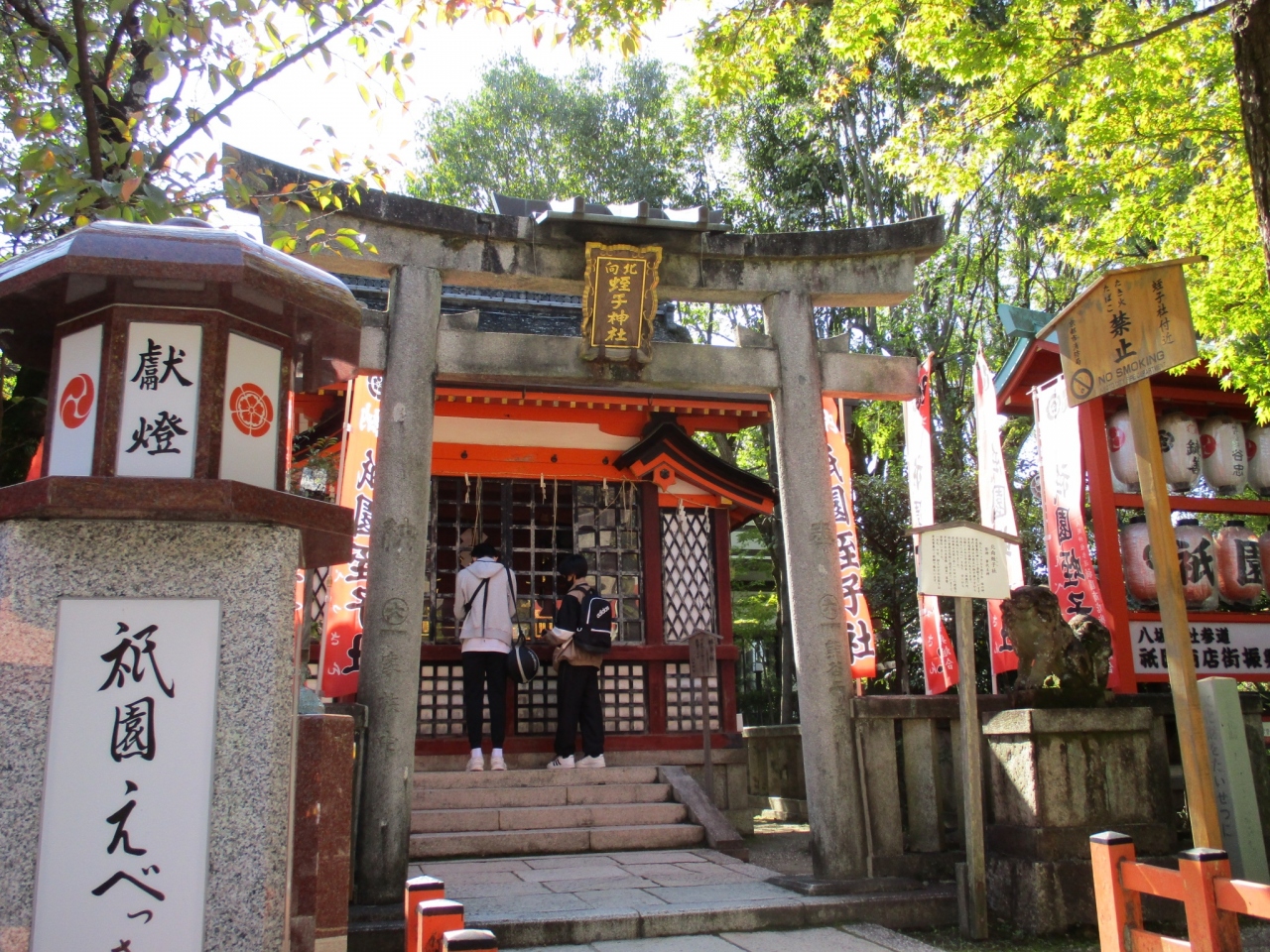 八坂神社の西楼門を入ると本殿までしばらく段差がある通りを歩きますが、その途中に北向き蛭子社があります。社殿が北を向いています。祇園のえべっさんとして親しまれているようです。えびすさま像もありました。人通りの多いところにあり、縁起がよさそうです。