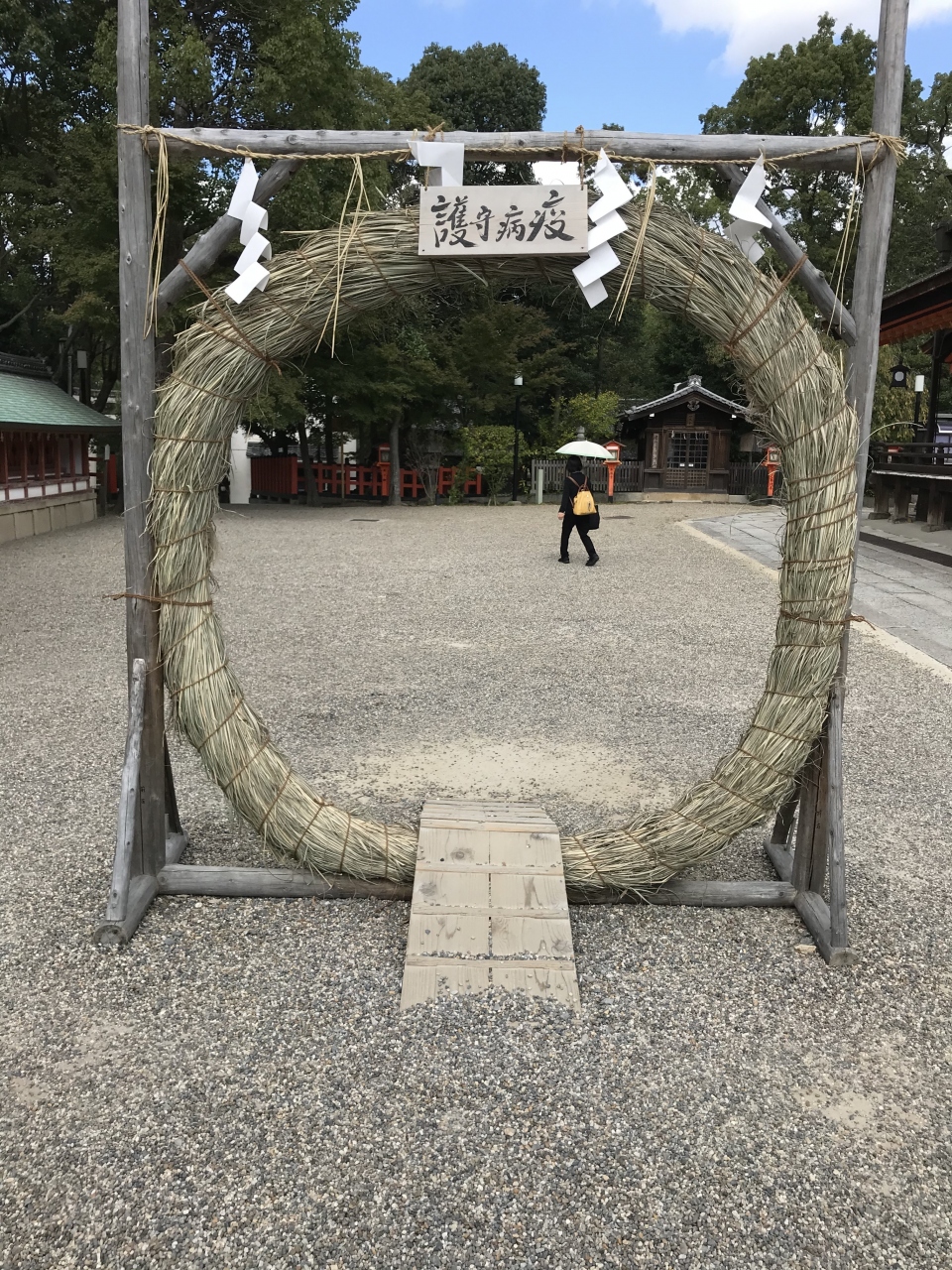 新型コロナウイルスの鎮静化を願って、疫病の神様として有名な八坂神社の「疫神社」へのお参りと「茅の輪くぐり」に行ってきました。茅の輪は疫神社の鳥居にあると思っていたら、八坂神社の本殿側の通路に設置されていました。「茅の輪くぐり」は平日でしたが、10分ほど並びました。