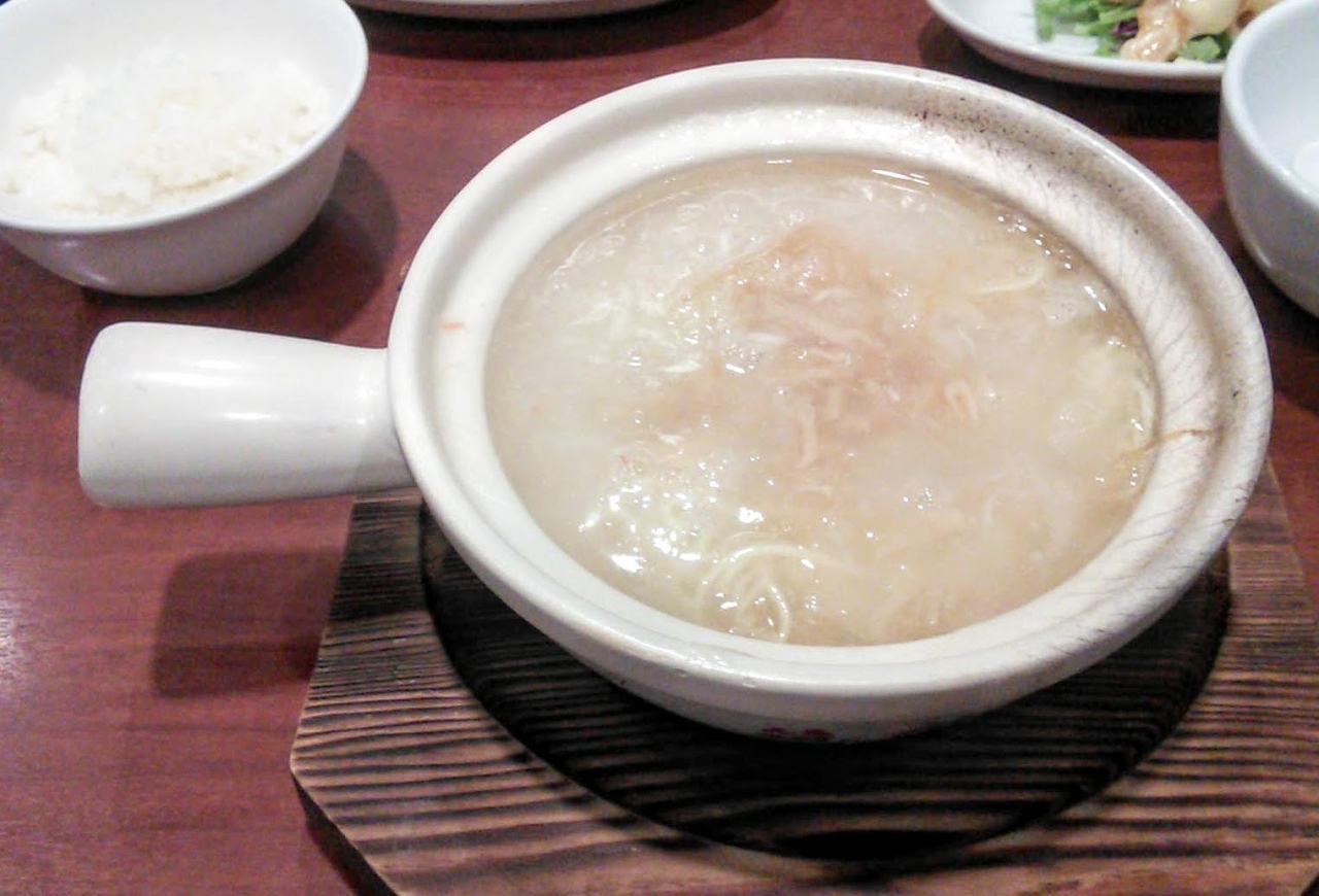 東京駅八重洲側にあるレストラン街、キッチンストリート内にある、ふかひれの専門店です。ふかひれの煮込みつゆそばセットと、ふかひれと蟹肉の煮込みつゆそばセットを食べ比べました。蟹肉入りは塩味であっさりしていて、麺を食べた後に残ったあんかけにごはんを入れて食べると無駄なくおいしくいただけます。セットに付いてくる海老のマヨネーズ和えも、食べ応えのある大きさでした。