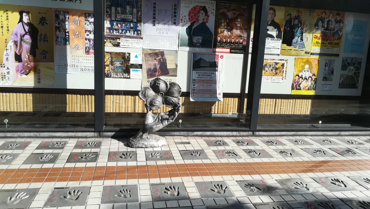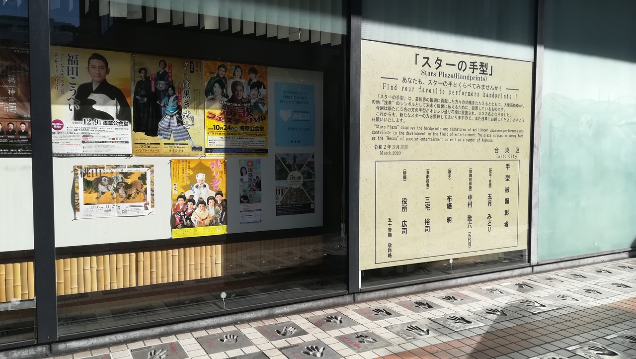 浅草公会堂前の通り前には沢山の手形が飾ってあります。それを見に行くだけでも楽しいですね。公会堂中に入って、インフォメーションがありますので、これからの上演会等聞けますので良いです。1階にあります、お化粧室内のタイルがレトロ感がありました。