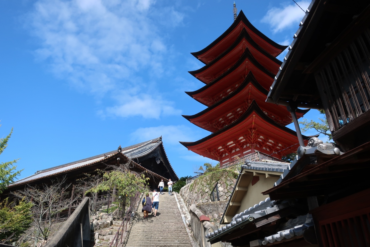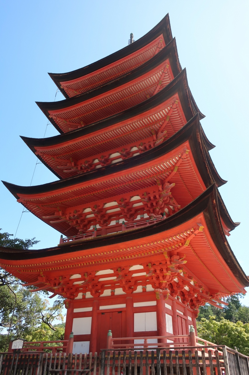 厳島神社から階段を上ったところにありました。高台にある五重塔は、朱塗りで美しく映えていて、どこから見ても見事な建造物だと思えました。また、和様と唐様の融合された建物です。厳島神社の五重塔かと思いきや、豊国神社の五重塔だということがわかりました。そこへ行くための階段は結構きついですが、ぜひ堂々とした見事な姿を見てください!。おすすめです。