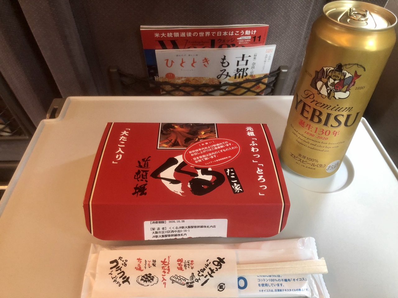 ビールと一緒にグリーン車内でゆったりといただきます。