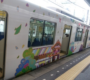 池袋行きの上り電車を待っていたところ、たまたまやって来たのがこのラッピング電車でした。沿線川越?の建築物やおまつりなどカラフルな図柄が目をひきます。
