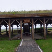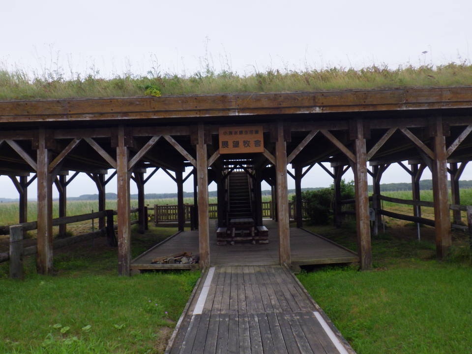 道の駅「はなやか(葉菜野花)小清水」を出るとすぐに「濤沸湖」に着きました。ラムサール条約に登録された湿地だということで湖のほとりに木道が付いていました。広大な湿地を見ながら木道を歩いて行くと、屋根付きの不思議な展望台に着きました。