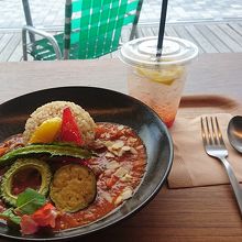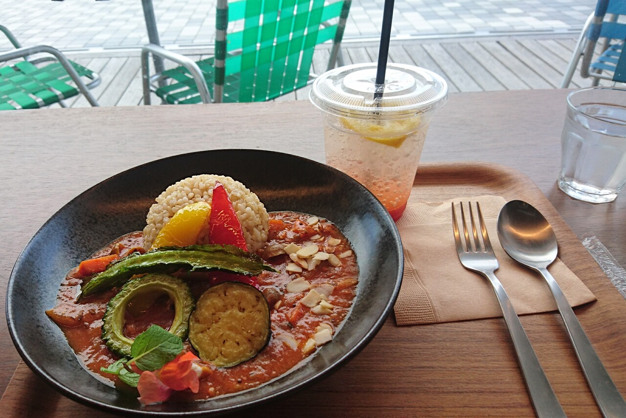 ゆいレールの県庁前駅の歩道橋直結の(2階)オシャレなカフェ。ガラス張りなので歩道橋から店内の様子が見える。(土)の13時頃は空いていた。カフェメニュー(パンケーキやパフェ)以外にもカレーやサラダもある。樂園カレー990円、アセロラレモネード550円を注文。少しお高め。カレーは辛くなく雑穀と合い体によさそう。お水と食べ終わった食器はセルフ。窓側とテラス席の椅子が何故かビーチに設置されているような安っぽい椅子だった。レジに利用可能なICカードやポイントの付くカードの説明表記が一切なく、都度店員が口頭で伝えているのは要領がよくないと感じたのが残念ポイント。