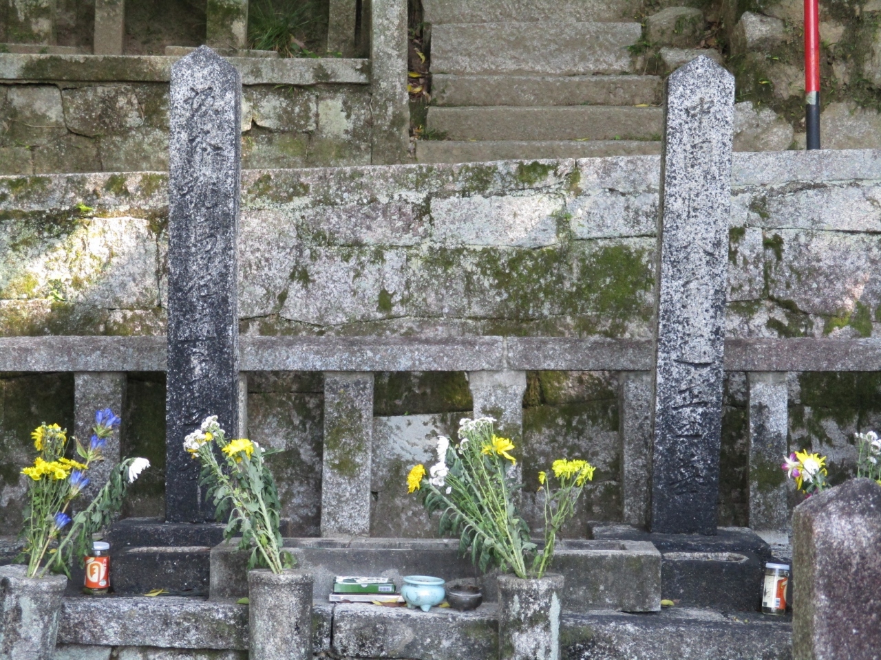 京都霊山護国神社に坂本龍馬をはじめ志士たちのお墓があります。こちらへ行くには有料で、300円必要です。電車の改札口のようなところを通るのが不思議なかんじでした。改札手前に昔の駅舎風な場所があり、そこにパンフレットやちらしが置いてありました。中に入って階段をのぼっていくと坂本龍馬のお墓があります。隣には中岡慎太郎のお墓があります。二人の像もありました。もう少し上まで行こうか迷ったのですが、今回はここまでで引き返しました。お墓にはきれいなお花が供えられ、大切にされていることがうかがえました。
