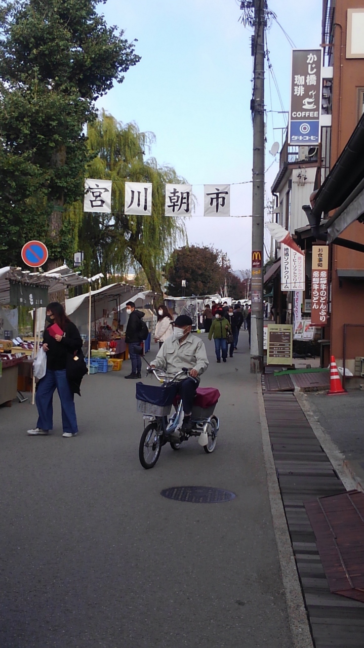 高山の宮川沿いに毎日ひらかれる朝市です。土曜日に行きました。観光客が大勢いました。お餅や野菜、トマトばかりのお店、たこ焼きやさんまでありました。お客さんは、日本人ばかりです。四角いお餅をたくさん買いました。