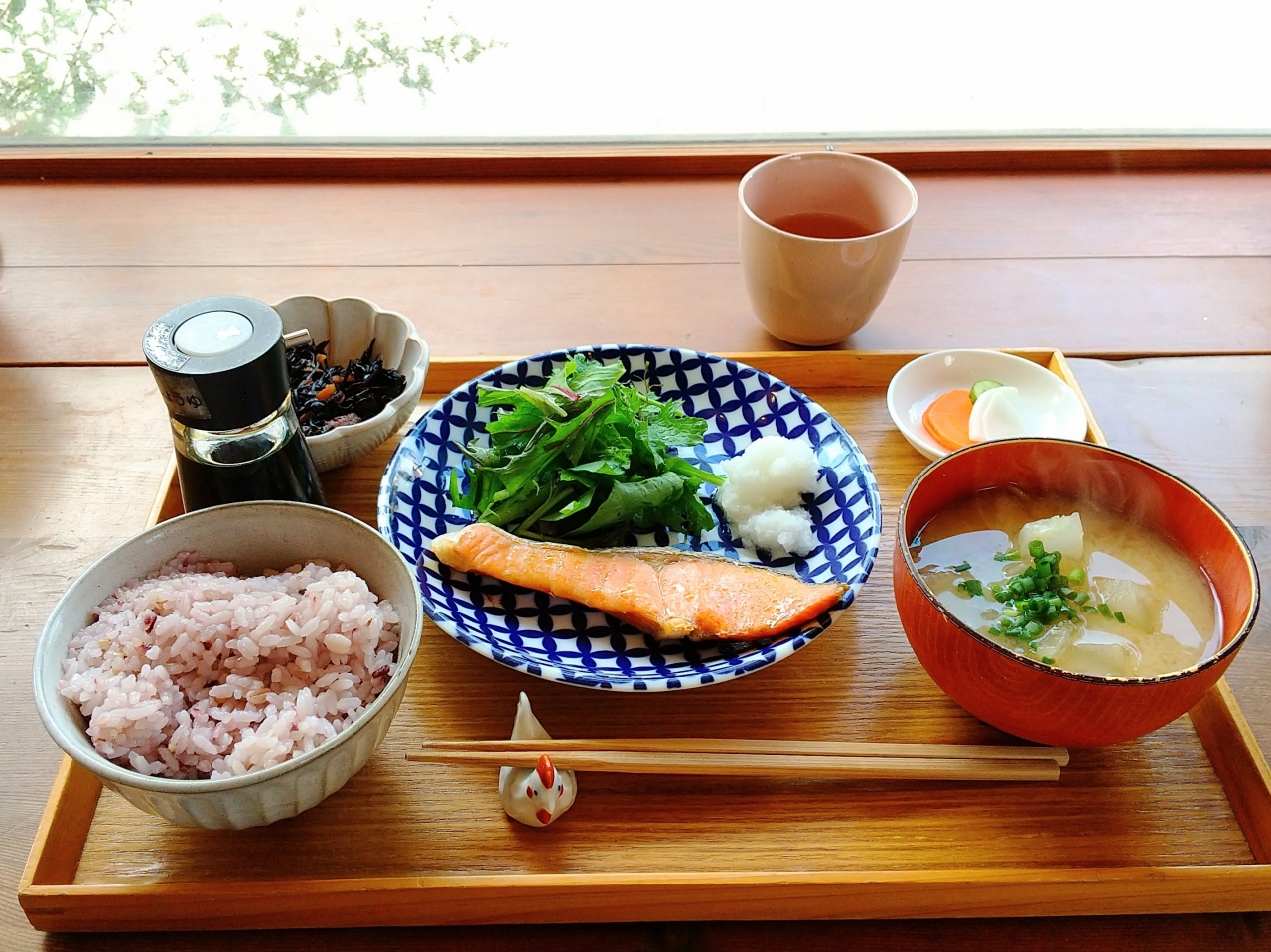内容は、ふっくらと焼かれた鮭、具だくさんの熱々のお味噌汁、小鉢(この日はひじきの煮物)、お漬物、五穀ご飯でした。