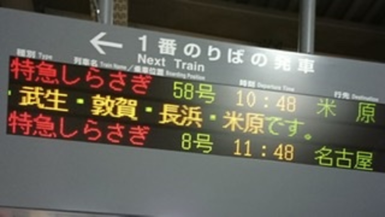 特急しらさぎ。滋賀県の米原駅から加賀温泉までの区間で、このしらさぎに乗りました。思ったより、横揺れがありました。パソコンとかをやってると、酔ってしまうかもしれません。昔ながらの雰囲気のいい、特急列車でした。
