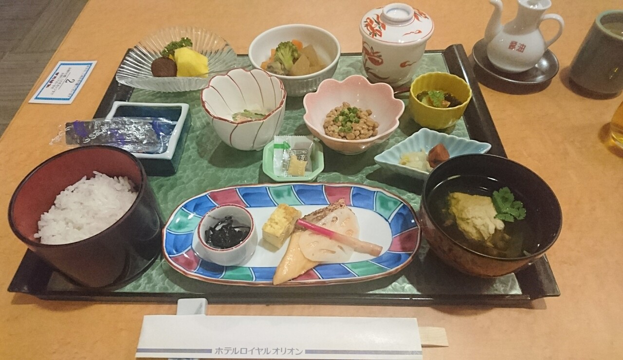 ホテルロイヤルオリオンに宿泊した際に朝食を頂いた。3階のエレベーターを降りて右手。入店時に検温あり。ルームキーの番号をお見せする。(日)の7時頃はとても空いていて和の雰囲気の中、静かにゆったりと朝食を頂けた。鮭も柔らかく、もずくやゴーヤチャンプルー、煮物にブロッコリーが入っていた。お茶以外のドリンクはセルフ。