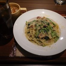 西新橋スクエアのすぐ近くにある、地下1階にあるカフェです。ランチは、パスタのセットが5種類あり、その中から選ぶようになっていました。先に会計をして、店員さんが席に持って来てもらうようになっていました。2人席になっているので、一人で利用している人が多く、打合せなどで使っている人もいました。割とゆったりしやすい雰囲気のお店でした。