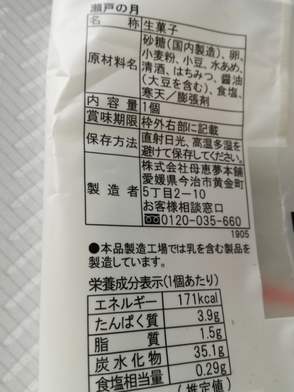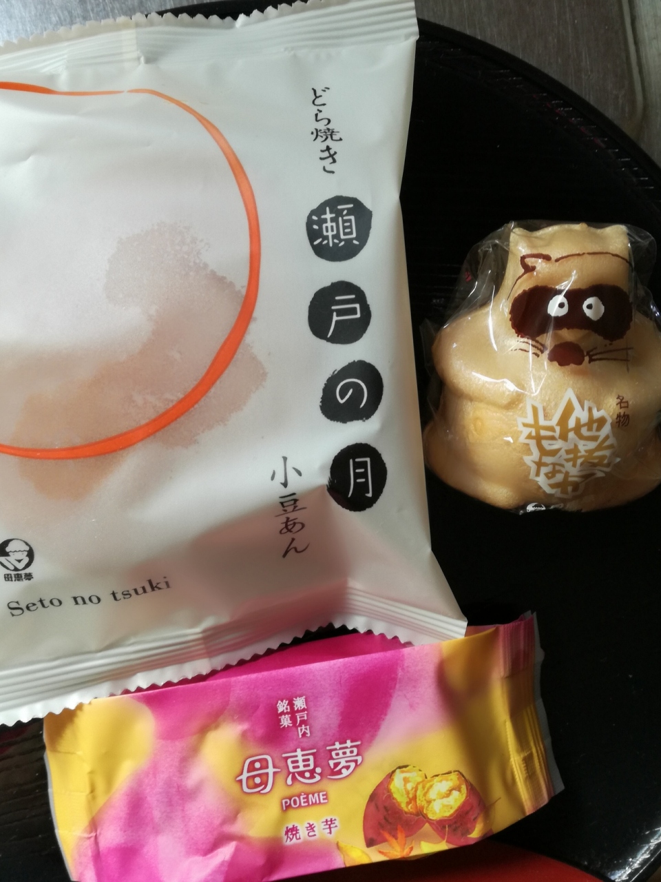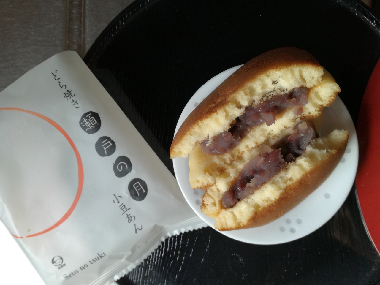 ・「瀬戸の月」 ふわっふわの生地に小豆餡を挟んだどら焼き。甘くって一度では食べきれない(_ _)