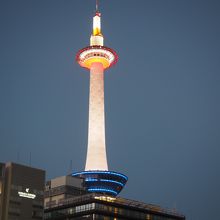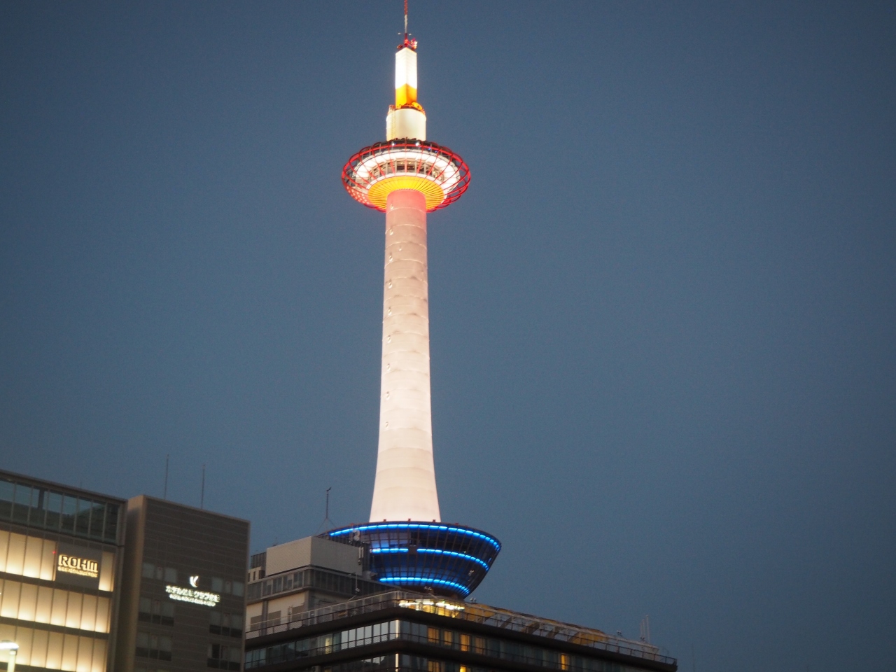 京都駅烏丸口を出てすぐ目の前に京都タワーはあります。京都駅前のホテルに宿泊したので、夕食や買い物目的で夕方に外出しましたが、目の前のライトアップされた京都タワーは美しく見ごたえがありました。新しく京都タワービルの1階には飲食街になっていて観光客が楽しめる場所になっていました。