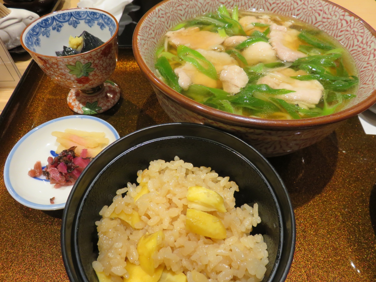 伊丹空港2階のレストラン街にあるうどんすきと麺類の店です。大阪の老舗の支店なので味は保証付き。とりなんばそばのセットにしましたが、鶏が実に上等な肉で感動、お出しが美味い。セットの栗ご飯も栗が一杯でホクホク。2時近くでもほぼ満席なのがよくわかりました。