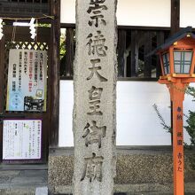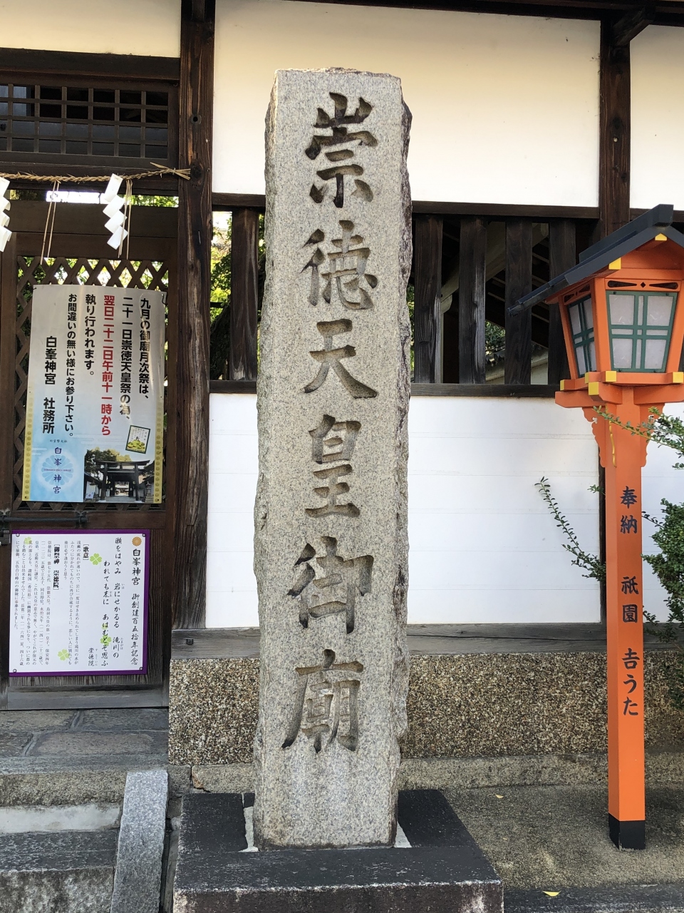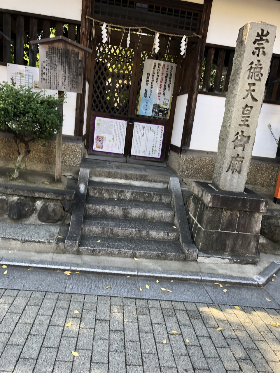 祇園界隈を散策していて見つけました。「こんなところに、崇徳天皇の御廟があるなんて・・」と少し驚きました。明治時代になってからは崇徳天皇を祀った白峰神宮が建立されたので、今はここも白峰神宮が管理しているのでしょうか、御廟月次祭についての白峰神社の張り紙がしてありました。