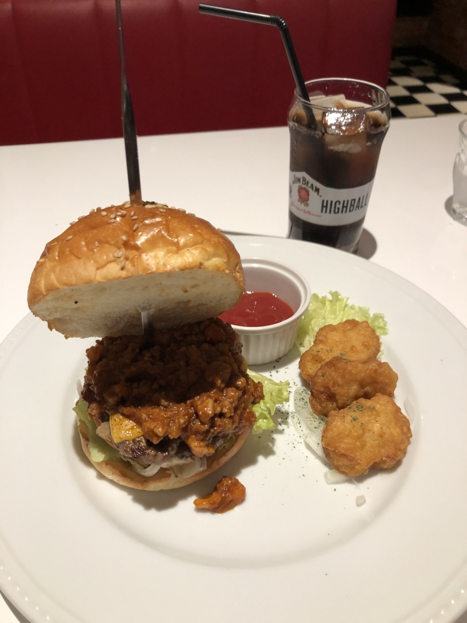 地下鉄南北線中島公園駅から徒歩10分、市電山鼻9条電停からすぐ、菊水・旭山公園通り沿いにあるお店。赤を基調にしたアメリカンな店内は、カウンター席とテーブル席があり、店内のテレビではアメリカの映画が流れる。まるでアメリカ西海岸のバーガー店のよう。メニューは、ハンバーガーが中心ですが、ホットドックやカレーもあり。今回は看板メニューの「R9」のセットメニュー(チキンナゲットとコーラ)をオーダー。待つこと5分くらい、到着したR9のボリュームに圧倒。パテ、トマト、オニオンスライス、レタス、チーズ、ミートソース、マヨネーズが入っており、ガブリつくと、これが口の中で一体に。また、バンズのがちょうど良い柔らかさで、全体をまとめている。チキンナゲットも揚げたてで、ジューシー。ハンバーガーとホットドックは、プラス300円で、ドリンクとポテトorオリオンリングorチキンナゲットの付いたセットになるので、こちらはお得。食べ方や迷ったときのお助けメニュー表があり、これが結構使える。たまに食べたいアメリカンな味。